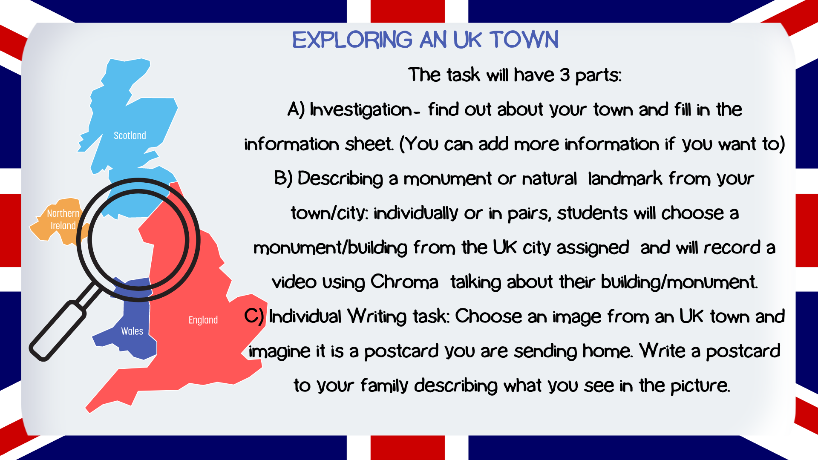 As a final task to keep on your travel journal, in groups of 3/4 people, you will INVESTIGATE about a city in UK. You will be given a QR code and when you scan it you will discover which city or town you will be exploring.