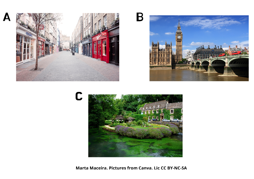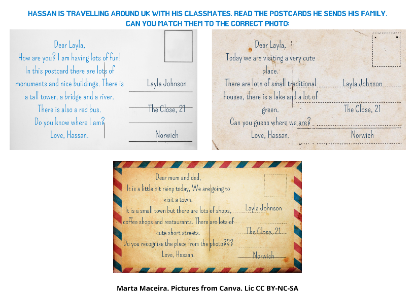 Hassan is travelling around UK with his schoolmates. He sends postcards to his family to share some of the palces he visits. Can you match each postcard to the correspondant picture?