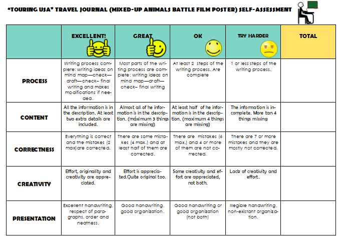 | Travel Journal | The final task is complete, at least 90%correct, it is neat and creative. (4) | The final task is complete, at least 70%correct, it is neat. (3) | The final tasks is complete, at least 50%correct. (2) | The final task is incomplete and /or less than 50% correct. (1) |