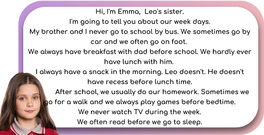 Write about what you do on a week day. Write at least 5 sentences. You can use the example below as a model.