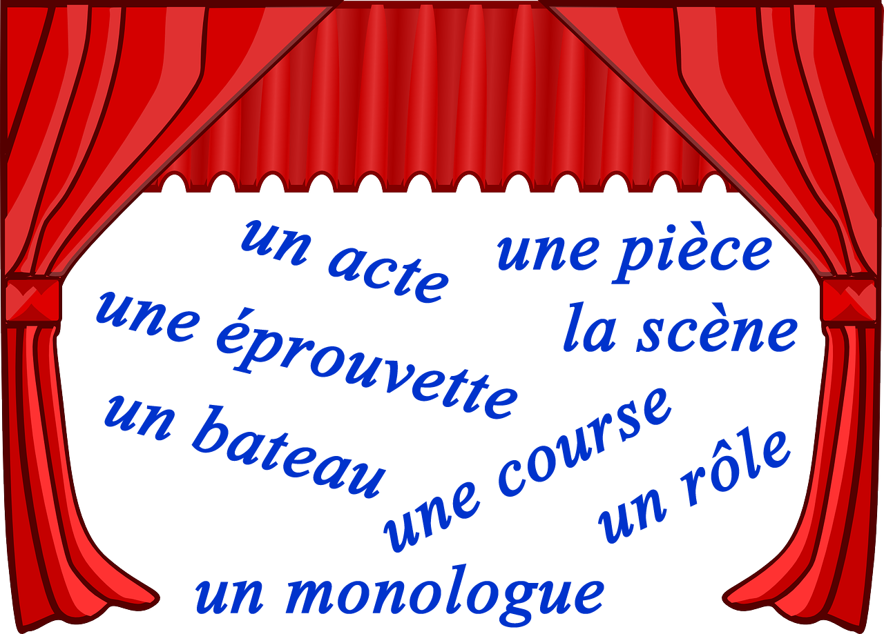 Cochez les mots qui correspondent au monde du théâtre. Question Réponses Option 1 Un monologue. Option 2 Un acte. Option 3 Une pièce. Option 4 Une éprouvette. Option 5 La scène. Option 6 Un rôle. Option 7 Une course. Option 8 Un bateau. Echo en retour Une éprouvette, une course et un bateau n'appartiennent pas au théâtre. Solution Correct Correct Correct Incorrect Correct Correct Incorrect Incorrect