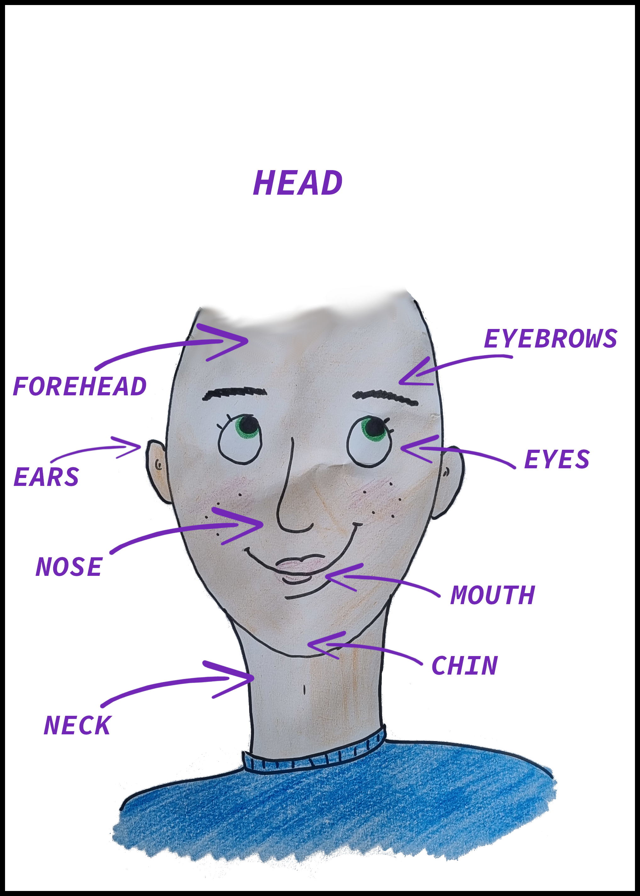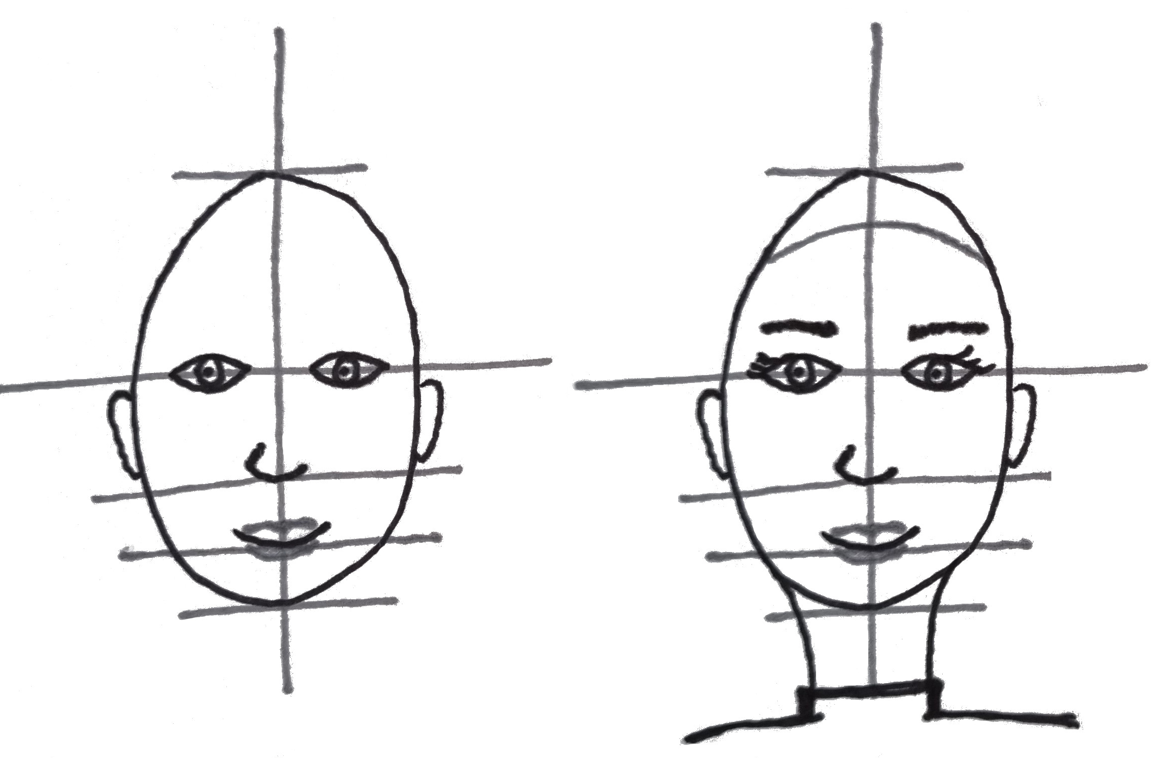 TASK 1. DRAWING A FACE Duration:20 minGrouping:Individual CLICK TO SEE THE PARTS OF THE HEAD LIST OF SUPPLIES STEP 1 DRAW THE HEAD AND TRACE TWO LINES OF SIMMETRY STEP 2 DRAW THE EYES. DRAW THE NOSE HALFWAY BETWEEN THE CHIN AND THE EYES. DRAW THE MOUTH HALFWAY BETWEEN THE CHIN AND THE NOSE. STEP 3 DRAW THE EARS AND TRACE THE DETAILS (NECK, EYEBROWS...)