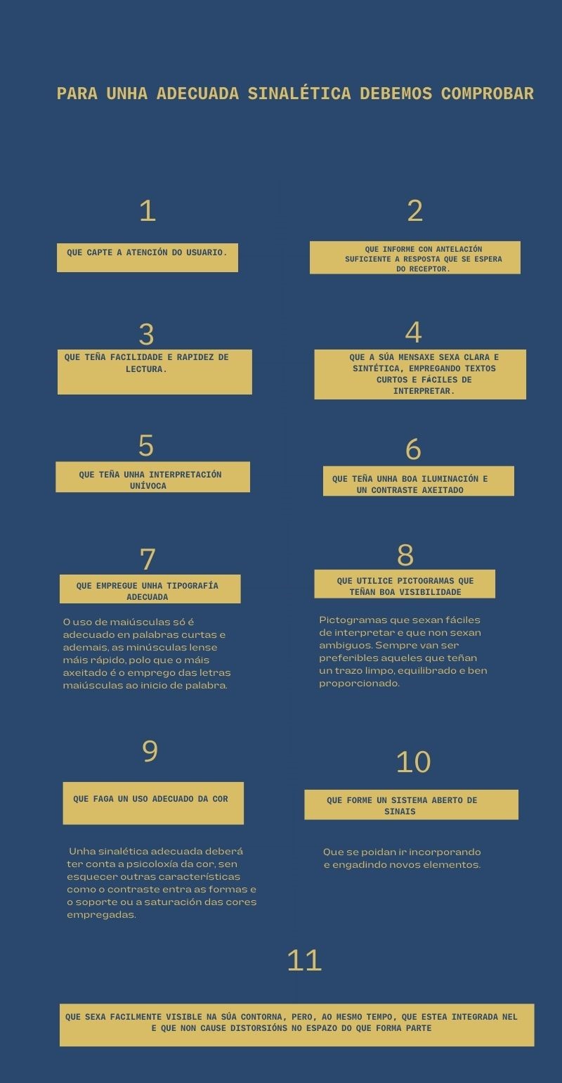 - Tipografía: para desenvolver un proxecto de sinalética hai que contar con elementos tipográficos como o tamaño da fonte, a súa lexibilidade ou contraste, a iluminación e cores que van ter, etc.