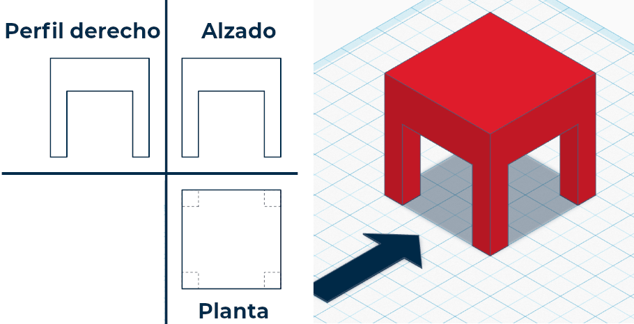 El alzado es la vista plana frontal. Miramos la escena de frente. Muchas veces, en la representación 3D de un objeto se incluye una flecha para indicar la dirección en la que tomamos el alzado.