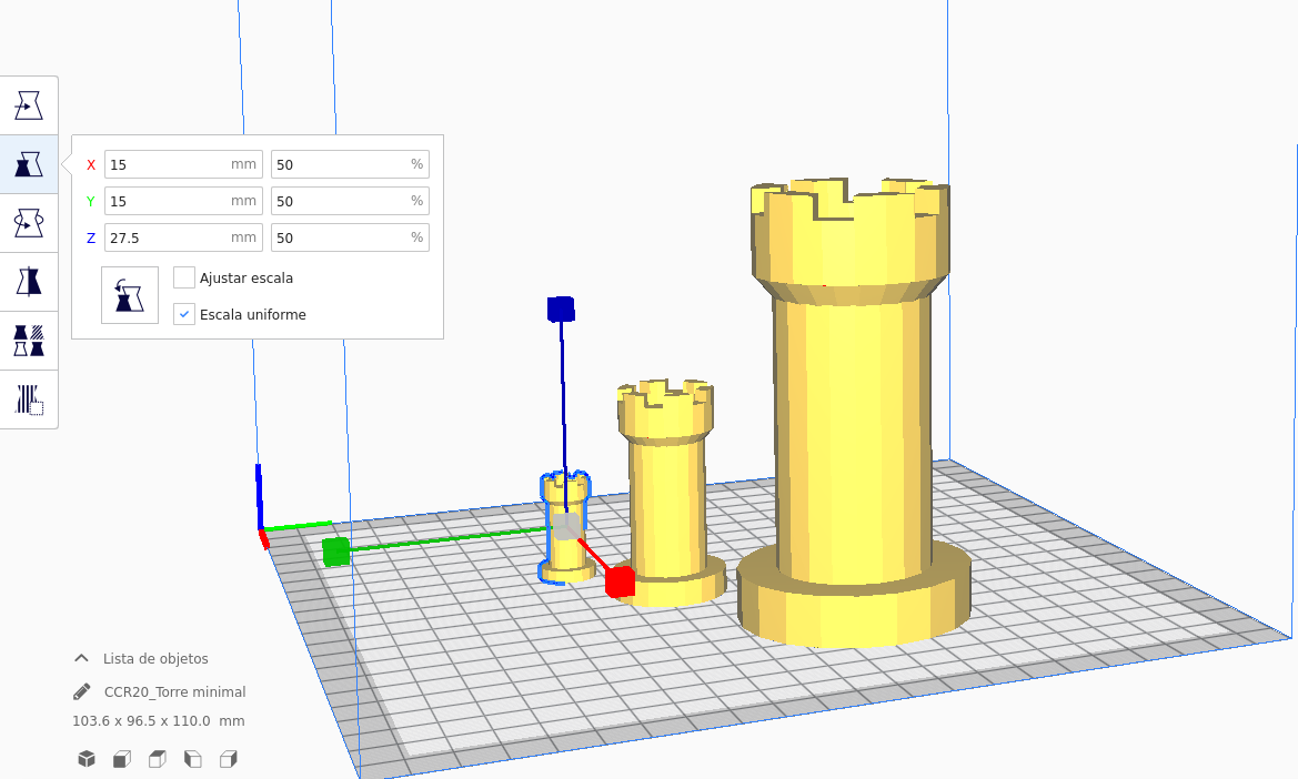 Podemos desplazar el modelo en la superficie de impresión, rotarlo e incluso modificar su escala. En la imagen puedes ver una torre preparada para imprimir al 50% de su tamaño o escala 1:2 (escala mitad), al 100% de su tamaño o escala 1:1 (escala natural) y al 200% de su tamaño o escala 2:1 (escala doble).