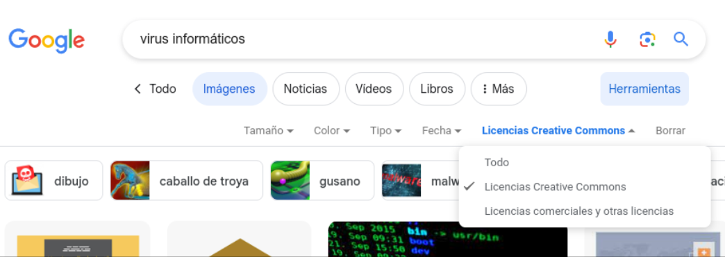 Aquí tienes un ejemplo para buscar imágenes sobre el término "virus informáticos" con licencias Creative Commons: