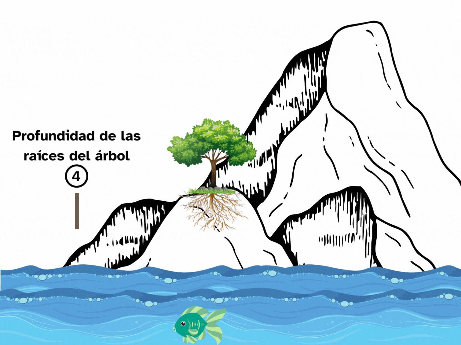 La profundidad de las raíces de un árbol se mide desde la base del árbol hasta la raíz que se encuentre más profunda. Esta medida se indica usando valores negativos.