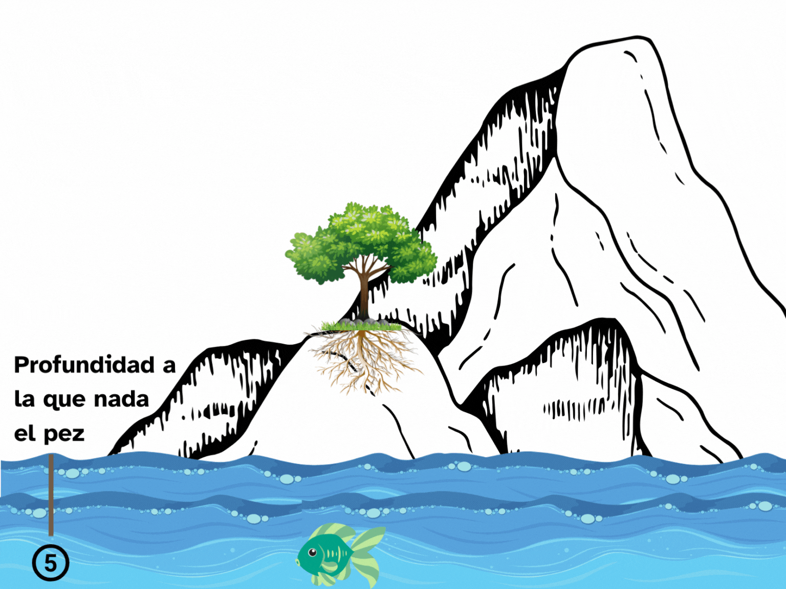 La profundidad a la que se encuentra nadando un pez, se mide trazando una vertical desde la superficie del agua hasta el lugar en el que se encuentra el pez. Esta medida se indica usando valores negativos.