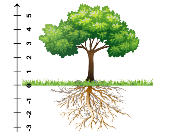 Ya sabemos que, cuando se trata de medir la altura de un árbol o la profundidad de unas raíces, podemos usar como origen o referencia el suelo. A partir del suelo, las medidas hacia arriba serán positivas y las medidas hacía abajo serán negativas.