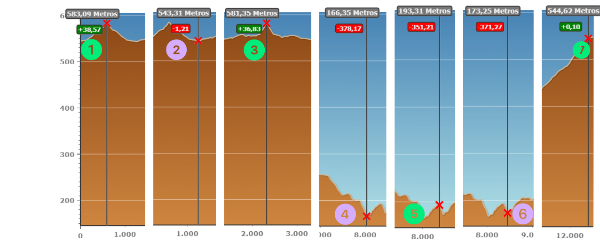 Desnivel positivo. El desnivel positivo es la suma de las subidas 1, 3, 5 y 7.