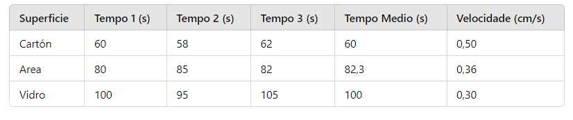 Colocamos caracoles en tres superficies distintas (cartón, arena y vidrio) y medimos el tiempo que tardaron en recorrer 30 cm. Cada medición se realizó tres veces para cada caracol y superficie. Finalmente, calculamos la velocidad media de los caracoles.