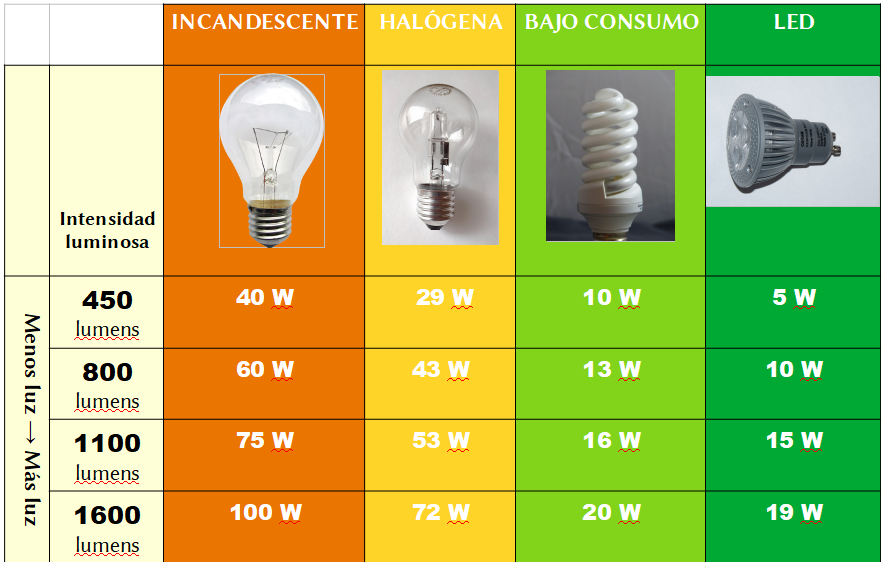 Look at the table. It shows 4 different types of light bulbs that can be used for lighting. Within each type, you can choose bulbs with a higher or lower luminous intensity (that give more or less light).