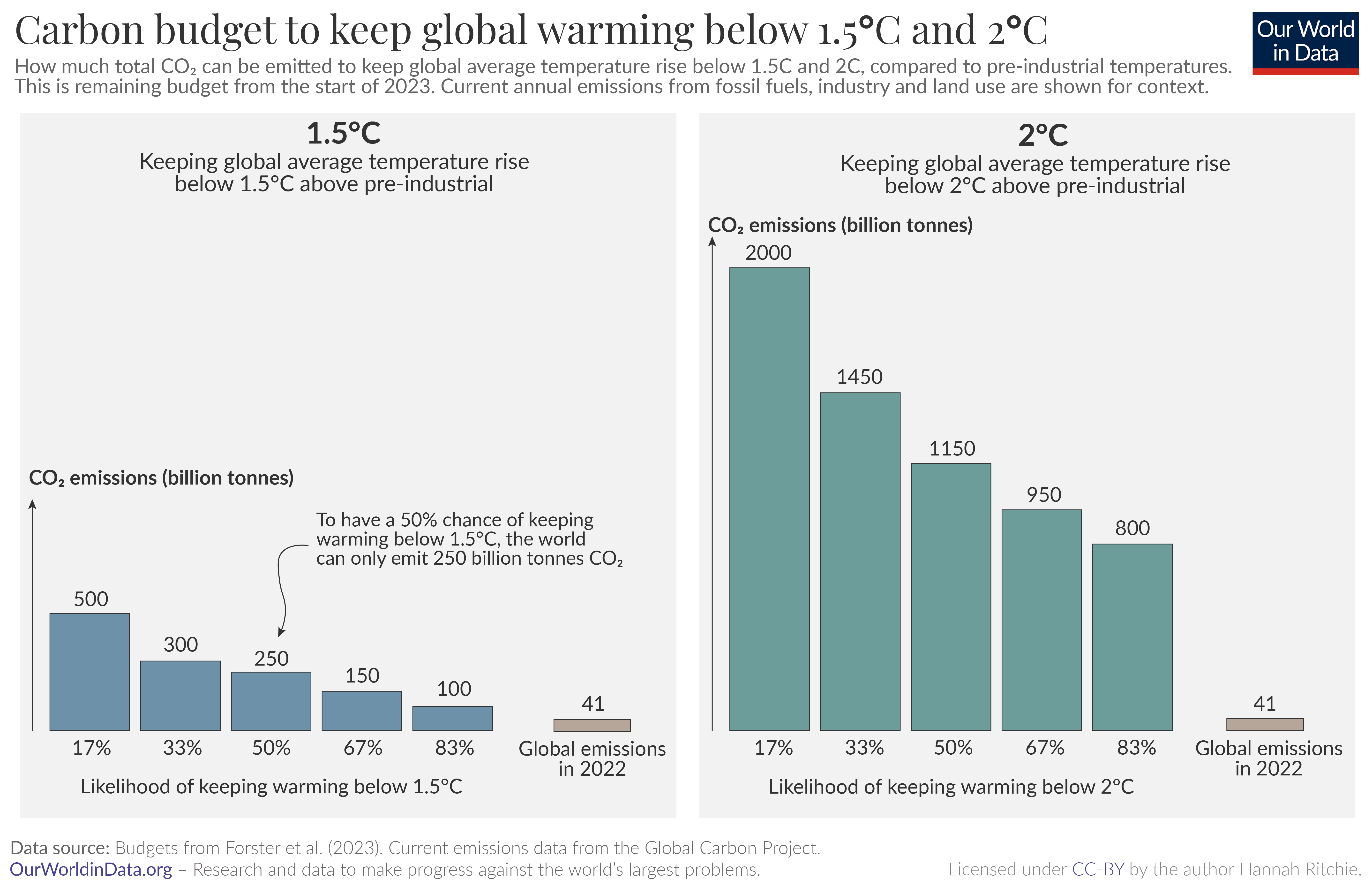 The world emitted 41 billion tonnes of CO2 in 2022. If we continue to emit at the current rate we will exhaust our budget in 6 years: