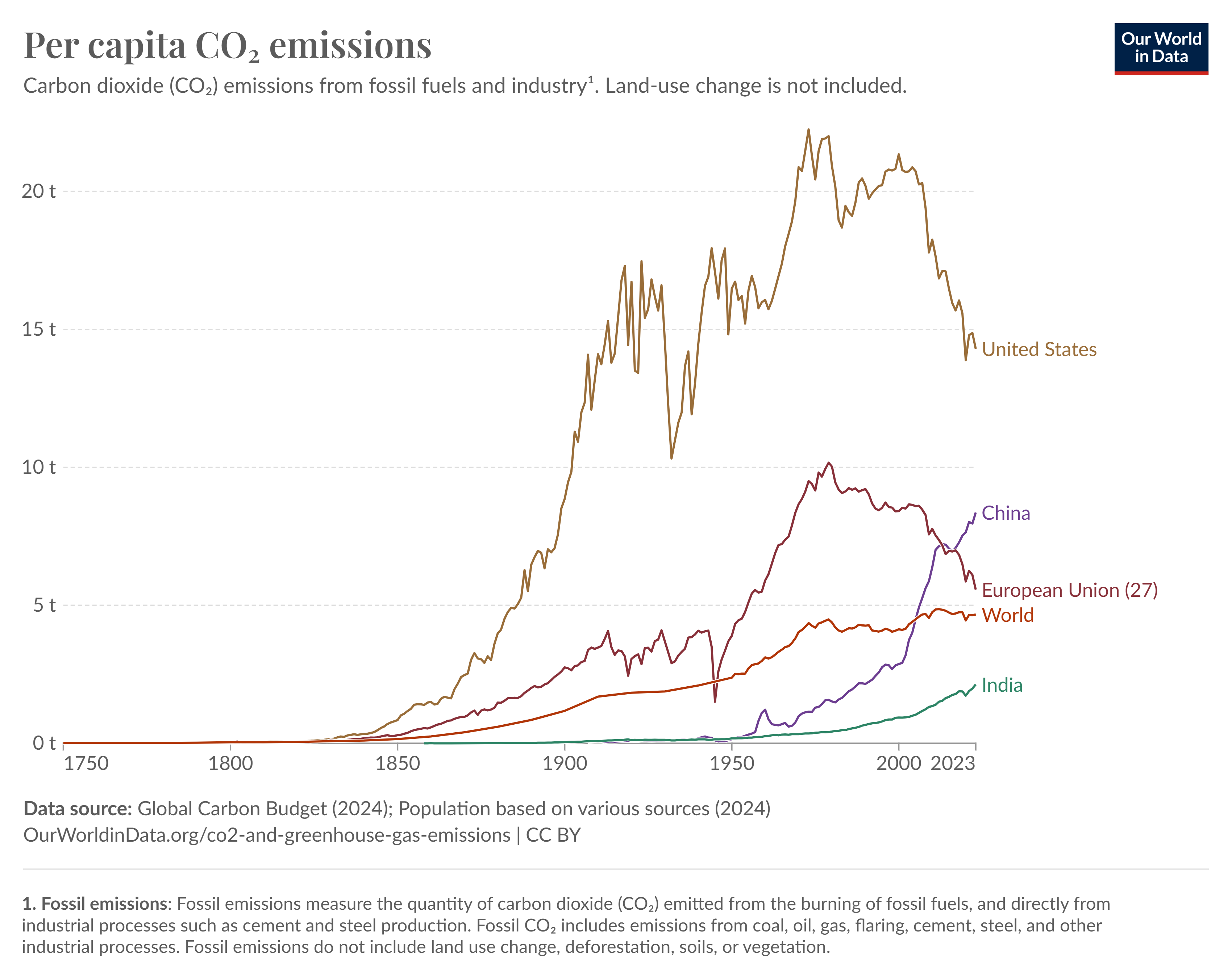 CO2 emissions, Global Carbon Budget (2024), data mainly processed by Our World in Data, Our World in Data , CC-BY-4.0