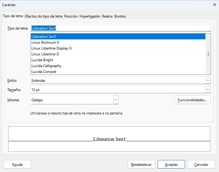 Aparece unha xanela emerxente cun listado de tipos de letra. Ao ir picando no nome de cada tipo podemos ver un exemplo na mesma xanela. Escollemos o que máis se adapte ás nosas preferencias e prememos no botón "Aceptar".