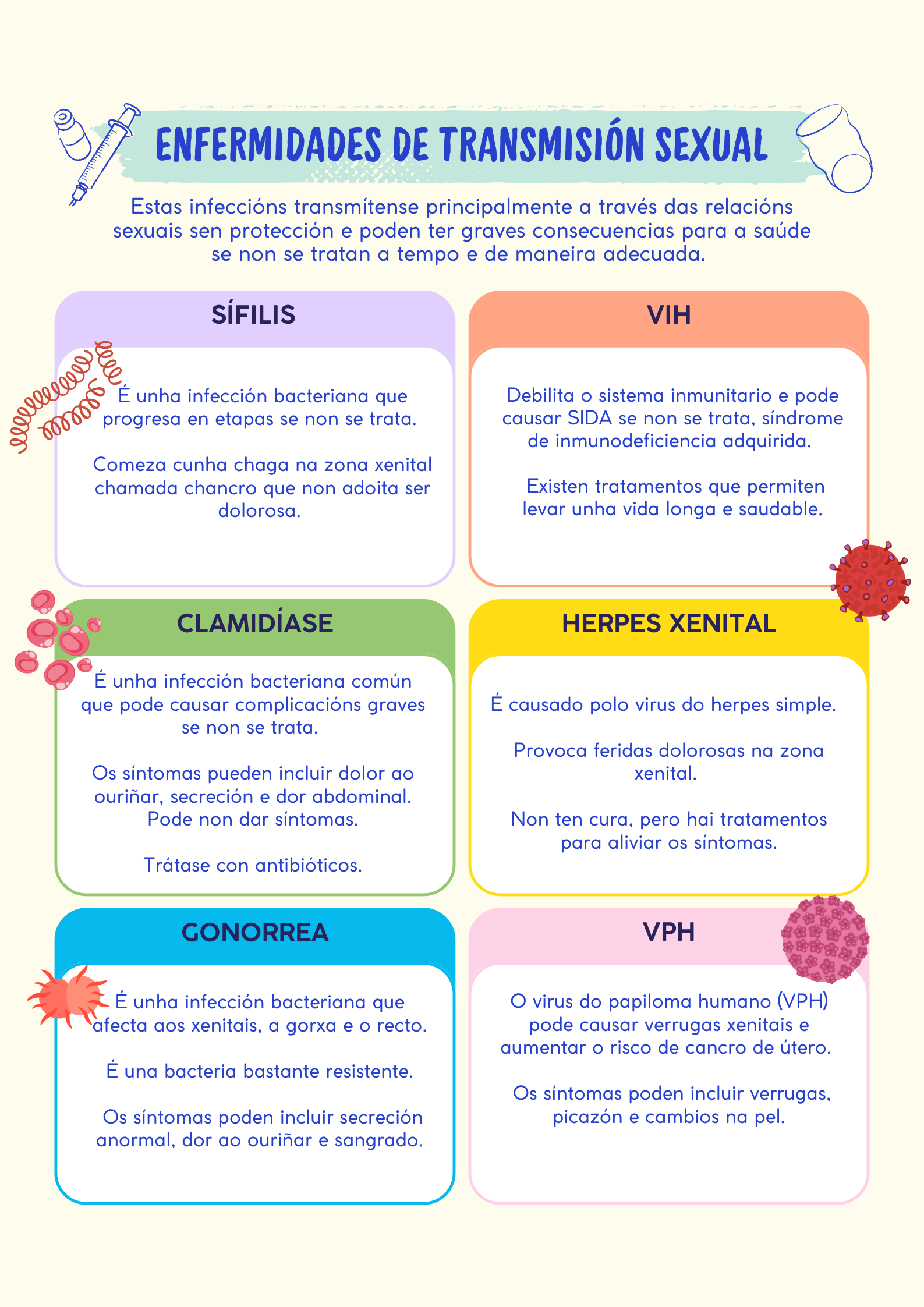 As Infeccións de Transmisión Sexual, tamén chamadas ITS, son enfermidades que se transmiten de persoa a persoa a través das relacións sexuais sen protección.