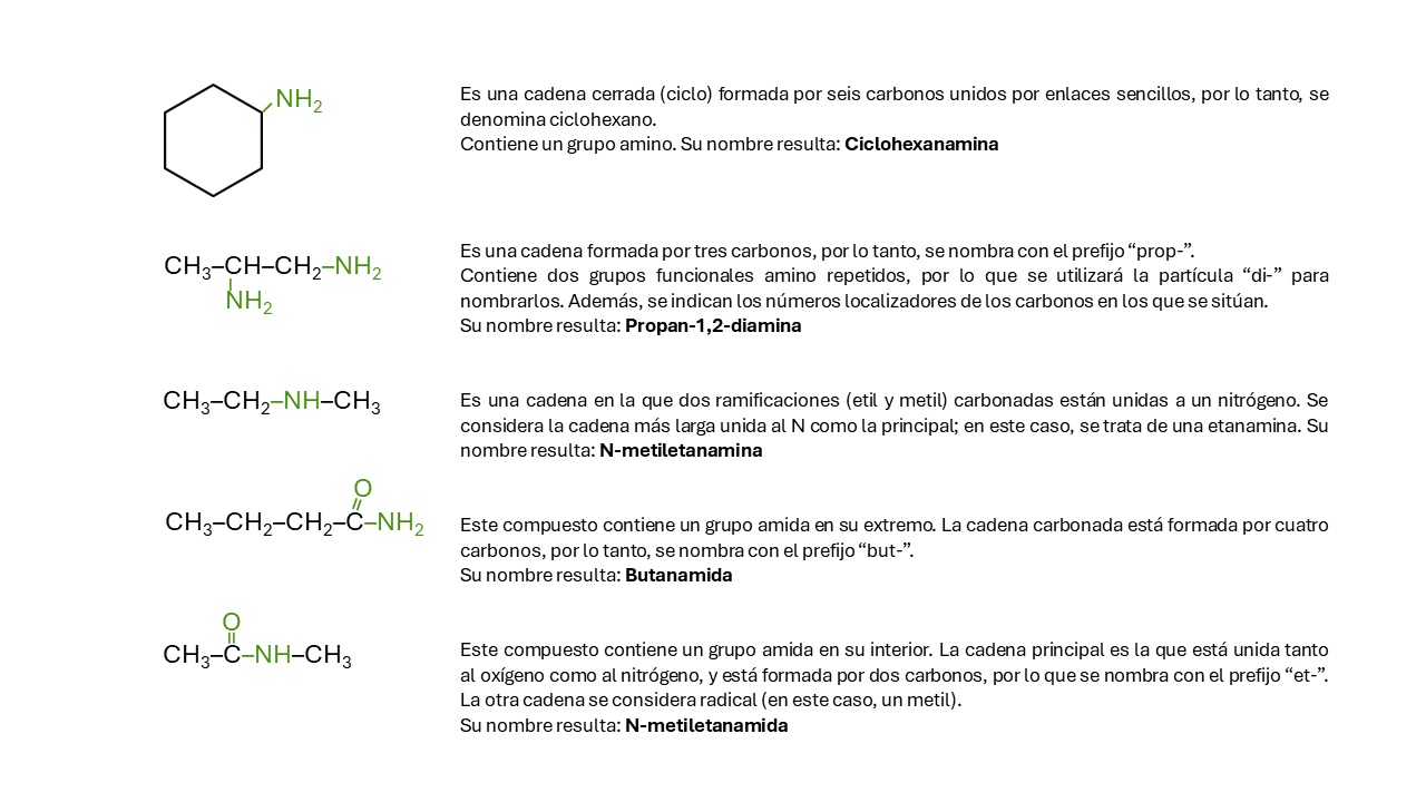 Amida. Contiene un átomo de N unido al carbono de un grupo carbonilo. Los restantes dos enlaces del nitrogéno pueden estar unidos a hidrógenos o a otros átomos de carbono; en este último caso, estos se considerarían radicales. Se utiliza el sufijo -amida para nombrar estos compuestos. Los posibles radicales se anteponen al nombre, alfabéticamente, e indicando que cuelgan del nitrógeno con el localizador N-.