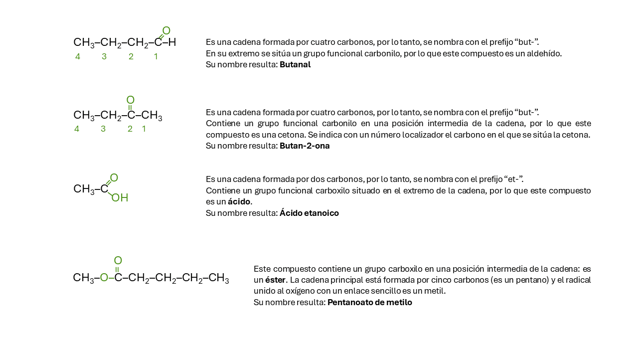 Aldehído. Contiene un grupo carbonilo -C=O en el extremo de la cadena carbonada. Se nombra con el sufijo -al.
