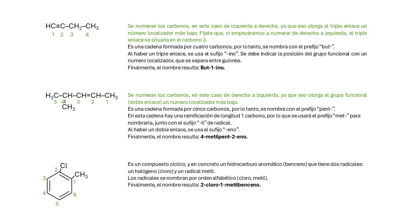 Para nombrarlos, la cadena más larga se numera empezando por el extremo más próximo al grupo funcional más importante. Se prioriza el doble enlace frente al triple, y por último van los enlaces sencillos.