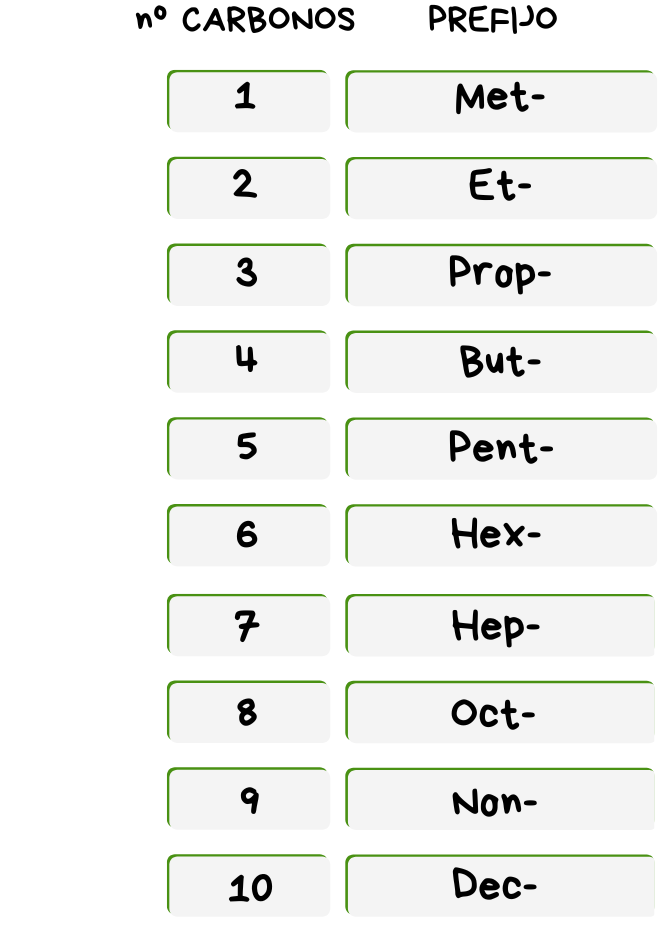 Contamos el número de átomos de carbono que forman la cadena más larga del compuesto. En función de este número, elegimos un prefijo de los de la tabla del margen. Este prefijo indica cómo de larga es la cadena carbonada.