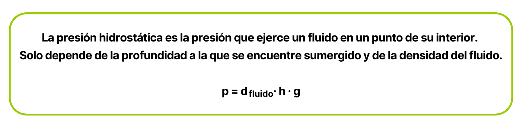 - La densidad del fluido (abreviada ρ o con la letra d): Si el fluido es más denso, ejercerá más presión. Por ejemplo, el agua salada tiene una densidad mayor que el agua dulce, por lo que a la misma profundidad, la presión será mayor en el mar que en un río.