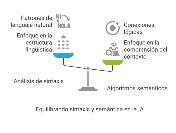 La inteligencia artificial precisa comprender la relación entre sintaxis y semántica para generar contenidos que sean legibles y coherentes. Los modelos de procesamiento del lenguaje natural (PLN) analizan grandes corpus textuales para identificar patrones y reproducirlos de manera natural. Por ejemplo, un asistente virtual debe reconocer si la consulta "¿Qué tiempo hace en Santiago?" requiere una respuesta meteorológica y no información histórica sobre la ciudad.