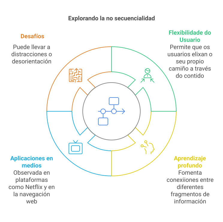 Además, la no secuencialidad puede verse como una forma de reflejar la complejidad del pensamiento humano y la manera en que procesamos la información. En lugar de seguir un camino único, la mente humana tiende a hacer conexiones entre ideas y conceptos de manera más libre y asociativa. Este enfoque permite que los usuarios establezcan relaciones entre diferentes fragmentos de información, fomentando un aprendizaje más profundo y significativo. La no secuencialidad también puede ser utilizada en diversos contextos, como en la educación, la investigación y la narrativa, donde se busca involucrar al usuario de manera activa y participativa, promoviendo un sentido de descubrimiento y exploración en lugar de una simple recepción pasiva de información. Esto se observa en plataformas como Netflix, donde podemos elegir episodios sin seguir una línea temporal estricta, o en sitios web donde navegamos entre páginas según nuestras necesidades. Esta flexibilidad contrasta con los textos tradicionales, donde el autor dicta el orden, y ofrece una experiencia más autónoma, aunque puede requerir mayor disciplina para evitar distraerse, desorientarse o perder el hilo.