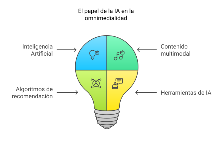 La inteligencia artificial (IA) integra todos los medios y formatos posibles de manera adaptativa. Las plataformas están adaptando sus algoritmos para recomendar contenidos según los intereses de la audiencia, combinando texto, vídeo, audio e interacción en tiempo real gracias al empleo de la inteligencia artificial generativa. Además, herramientas como los chatbots (ChatGPT, Gemini) demuestran cómo la IA genera respuestas multimodales, fusionando lenguaje natural con otros tipos de formas de presentar los datos: imagen, vídeo, audio.