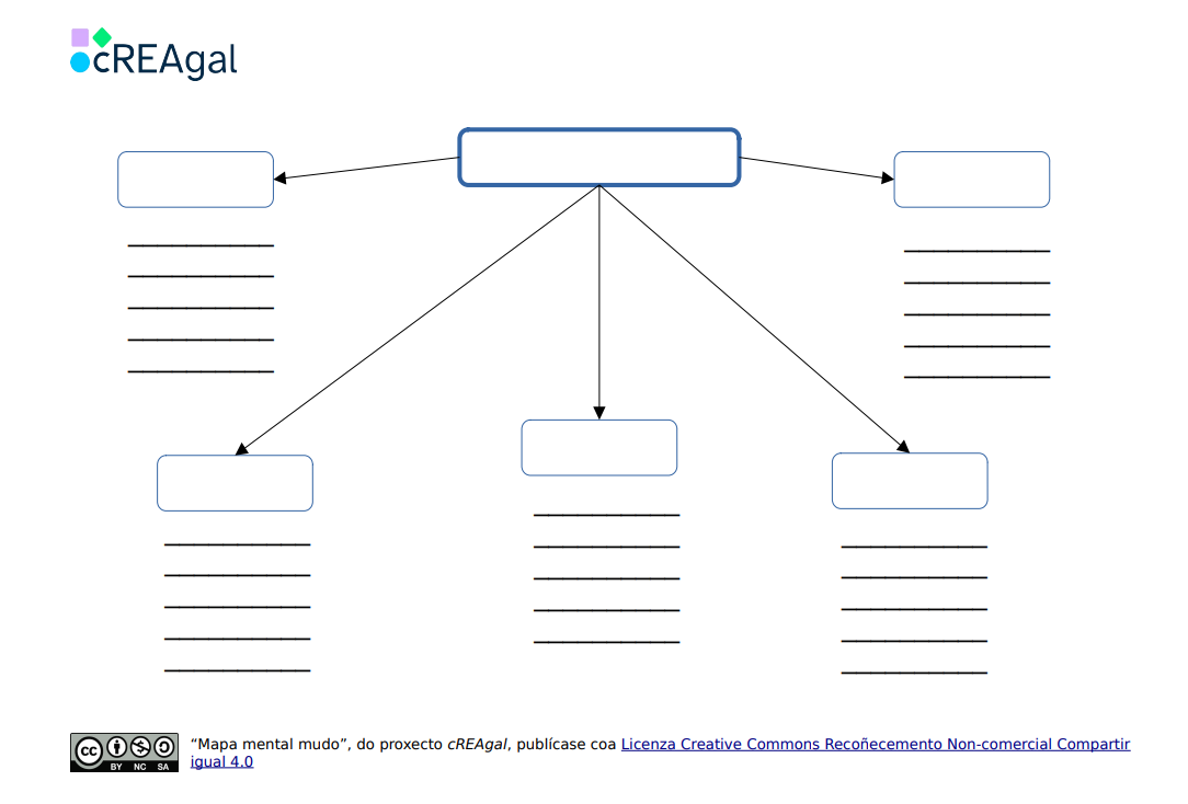 Podéis descargar el modelo de mapa mental mudo y cubrirlo. Recordad guardarlo al terminar y entregarlo según el formato y en el lugar que vuestra persona tutora os indique. También podéis dibujarlo en un folio y hacer vuestro propio diseño. Consultad con la profesora o profesor la mejor manera de hacerlo.