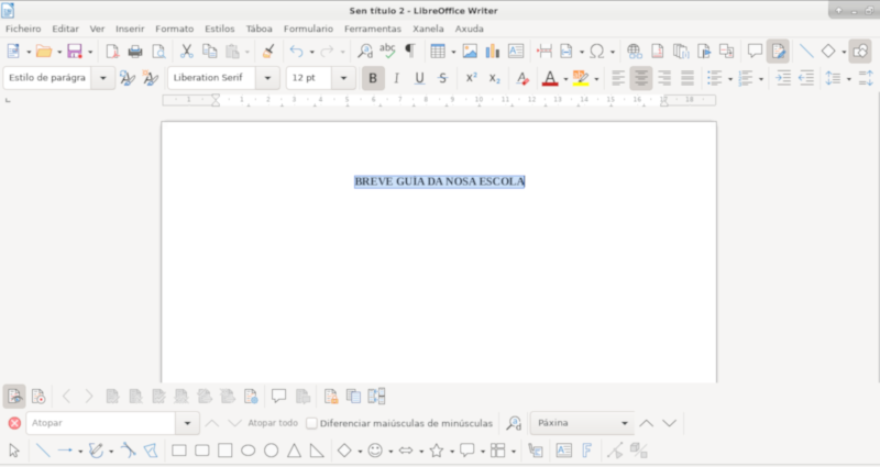 Inseride despois do título a foto e escollede o seu lugar no documento. O título pódese realizar no LibreOffice Draw empregando as letras tipo "banner" chamadas "Fontwork". Atoparedes a opción no despregable de inserir.