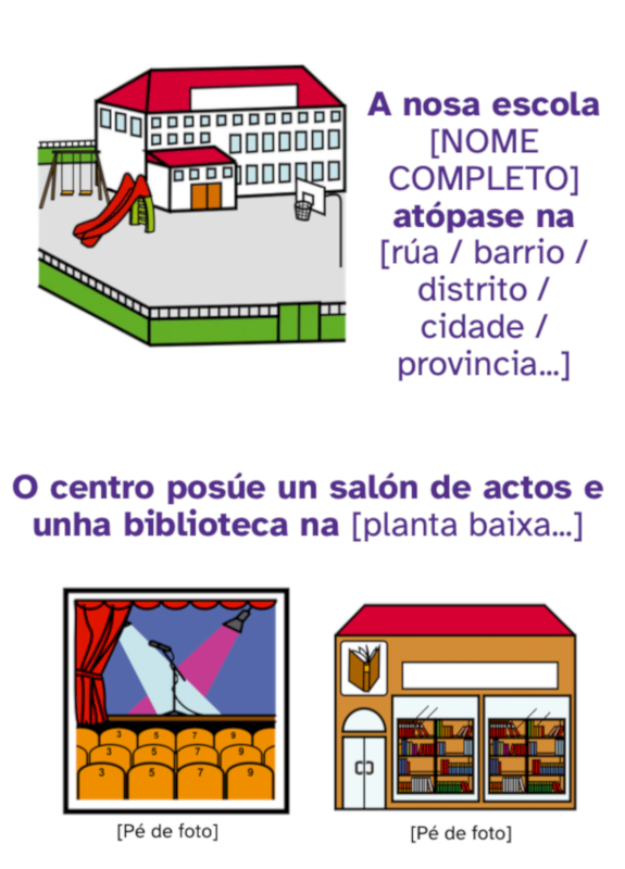 Pensade nas partes importantes da escola que vai necesitar o alumnado novo os primeiros días e as partes xenéricas que pode necesitar calquera persoa visitante.