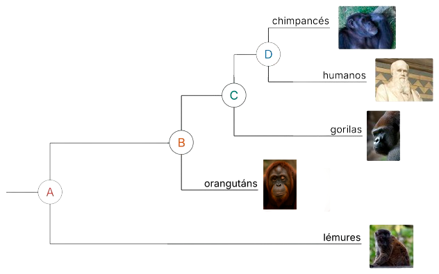 - No esquema cal é a letra que representa o antepasado común dos chimpancés e os seres humanos?