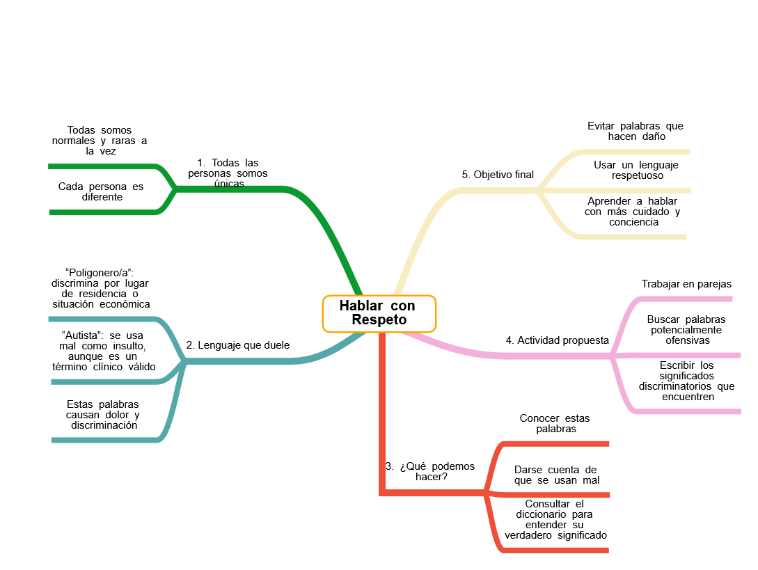 Evitar palabras que hacen daño. Y usar un lenguaje que respete a todas las personas. Podemos hablar con más cuidado. Podemos hablar mejor.