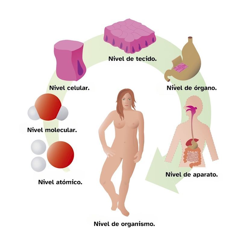 Os principais niveis de organización dun organismo, dende os máis simples ata os máis complexos, son: átomos, moléculas, orgánulos, células, tecidos, órganos, sistemas de órganos e o organismo.