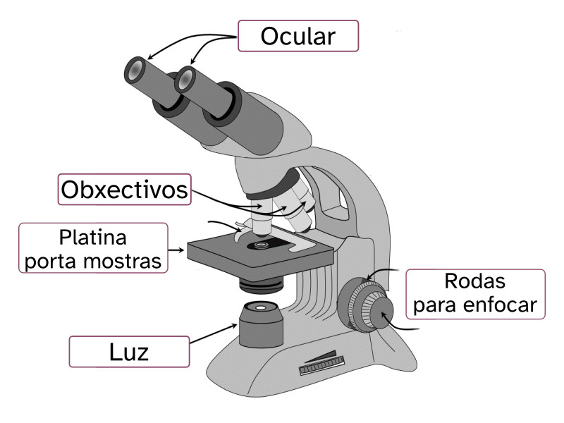 Como xa sabes, as células son demasiado pequenas para observalas a simple vista, polo que as científicas e científicos utilizan un instrumento imprescindible: o microscopio. Trátase dun aparello que permite ampliar moitas veces a imaxe dun obxecto para velo con precisión. Os microscopios que podes ter no colexio ou na casa son microscopios de luz, ou sexa, que funcionan coa luz que pasa ou se reflicte na mostra, e chega a unhas lentes que forman o ocular, ou a un dispositivo que funciona como unha cámara, que envía a imaxe a unha pantalla ou a un ordenador. Este tipo de microscopios tamén teñen o nome de microscopios ópticos.