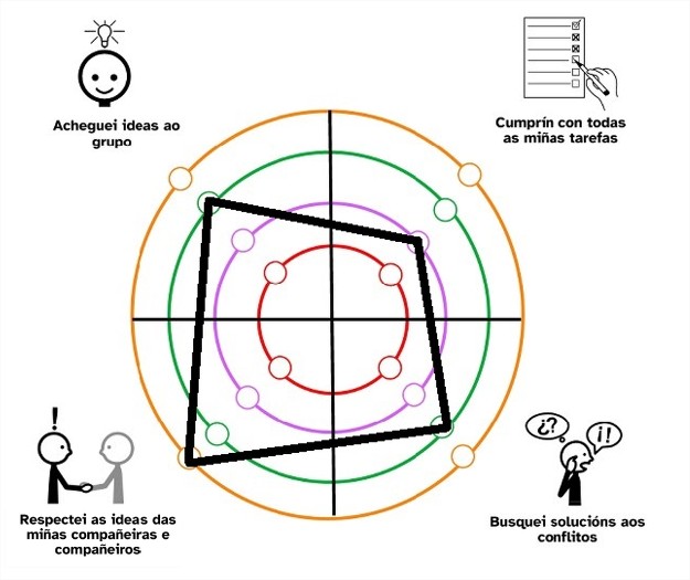 | Colaboración no equipo | Axudei sempre ao equipo,espectei as súas opinións e contribuín ao bo ambiente do grupo . (2.5) | Colaborei co equipo a maior parte do tempo, pero ás veces faltou un pouco máis de interacción. (2) | Colaborei só en certas ocasións e non sempre axudei cando era necesario. (1.50) | Apenas colaborei co equipo e iso fixo que o proxecto fose máis difícil para os demais. (1) |