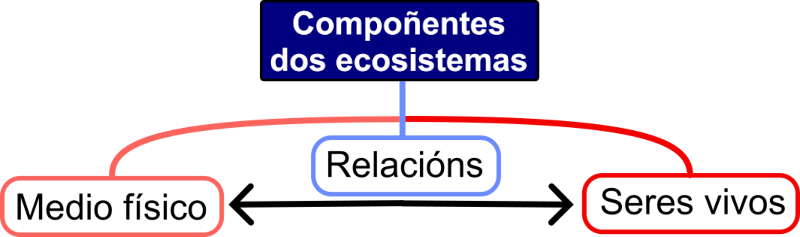 - As relacións entre os diferentes elementos do ecosistema: os seres vivos interactúan entre eles, e tamén co medio físico.