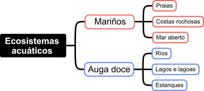 Nos ecosistemas acuáticos de auga salgada distinguimos as praias, as costas rochosas e o mar aberto.