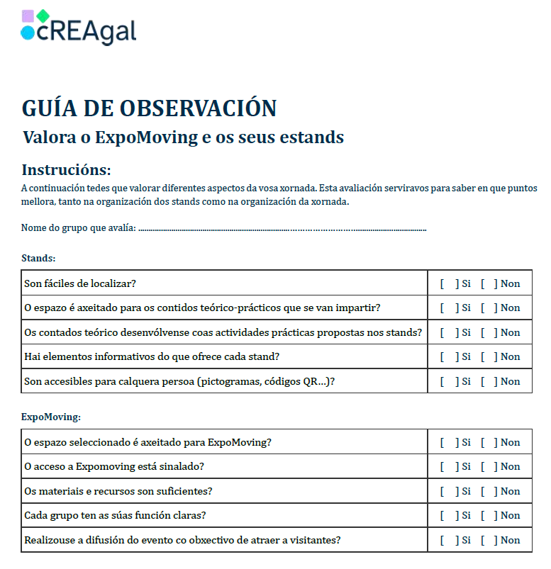 Unha vez feito isto, cubride a lista de guía de observación que tedes a continuación para comprobar que todo está listo. Se detectades cousas a mellorar, este é o momento de facer reaxustes ou modificacións.