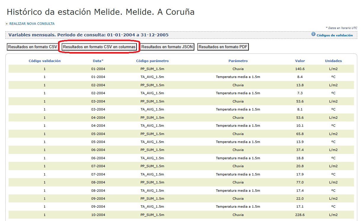 En la página del histórico de MeteoGalicia escoge la localidad (Melide), la fecha de inicio (1 de enero de 2004) y de fin (31 de diciembre de 2005) y las variables que vas a estudiar, temperatura (a 1,5 metros) y lluvia.