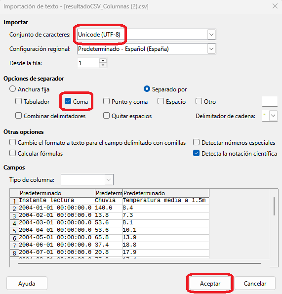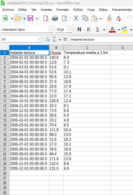 En este ejemplo vas a recoger, en una hoja de cálculo del paquete LibreOffice, la información de dos variables: temperatura media a 1,5 metros y lluvia total caída en cada mes de los años 2004 y 2005.