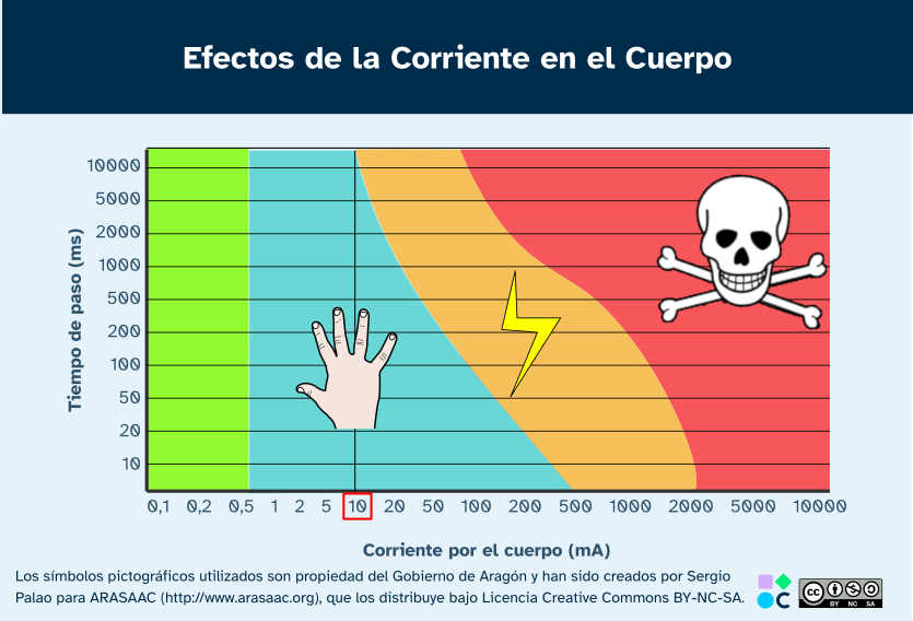 Los efectos de la corriente eléctrica en el cuerpo humano pueden ser muy dañinos. Depende de las partes del cuerpo afectadas, de la cantidad de corriente que circule, y del tiempo que pase dicha corriente por el organismo. En la siguiente imagen puedes ver de manera gráfica estos daños.