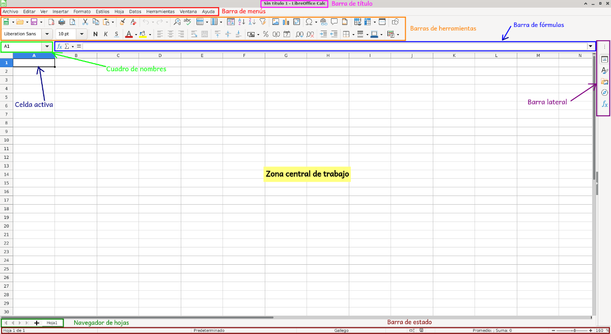 La ventana principal de LibreOffice Calc que tiene las siguientes partes: