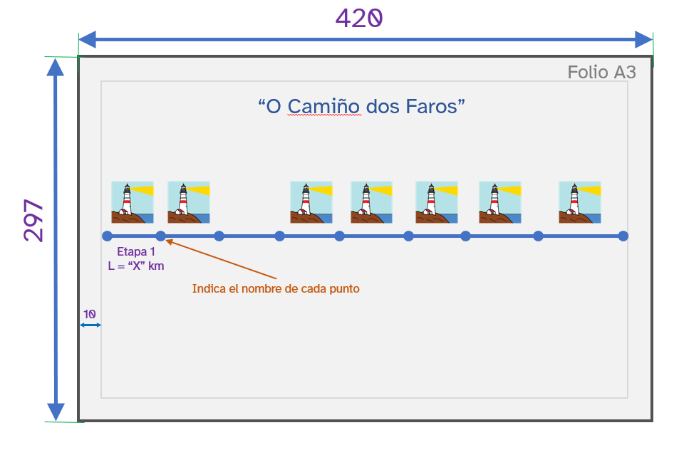 Representa "O Camiño dos Faros" en el folio A3 utilizando las longitudes calculadas y con los márgenes adecuados (1 cm).