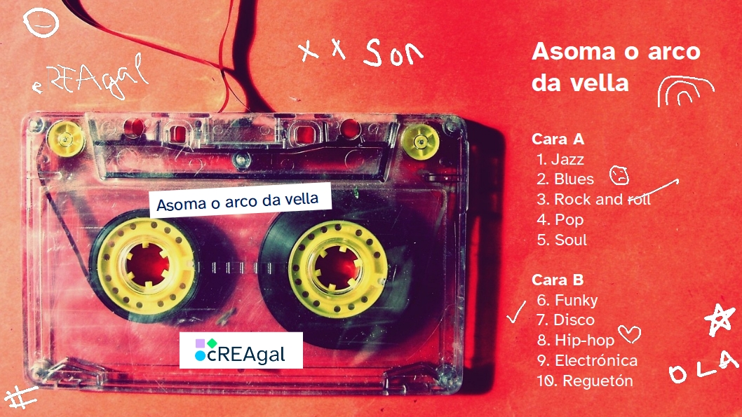 Preme sobre a lista de reprodución do casete para escoitar e ver exemplos de diferentes xéneros musicais do S. XX.