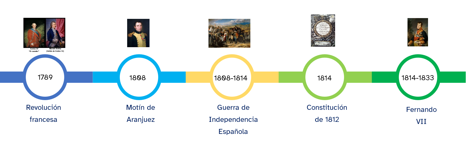 Na Guerra de Independencia, os españois loitaban. En 1812 fixeron a Constitución de Cádiz. Daban dereitos á xente. Pero Fernando VII anulouna. Volveu gobernar como rei absoluto.