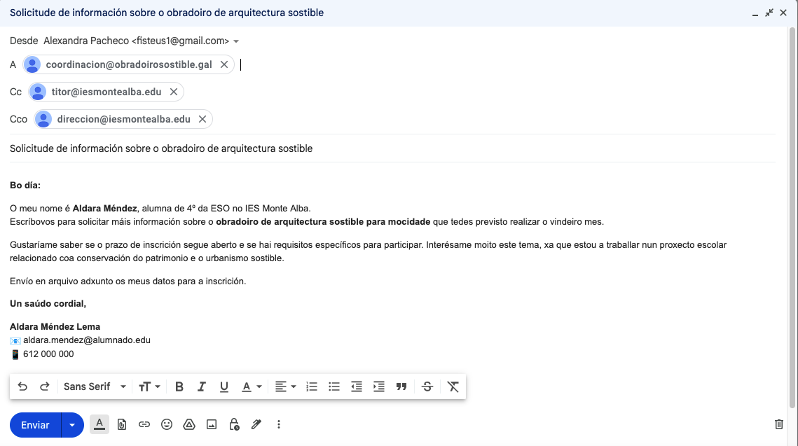 Observa o modelo de correo electrónico que aparece na pantalla. Hai varias iconas de 🔍 lupa sobre diferentes zonas do correo.