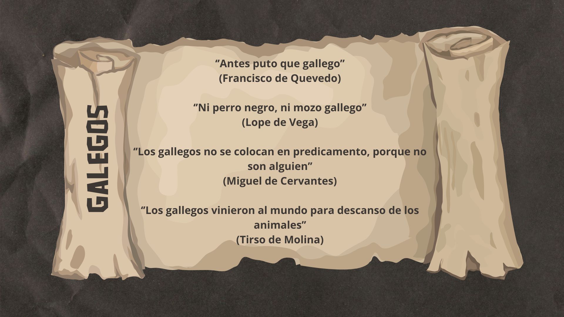 Imos repasar os prexuízos lingüísticos observando as descricións negativas que aparecen en boca dos escritores da literatura castelá durante o século XVI, isto é, os Séculos Escuros da literatura galega sobre Galiza, os galegos e as galegas. Para iso tedes que en parellas lelos e tratar de desmentilos.