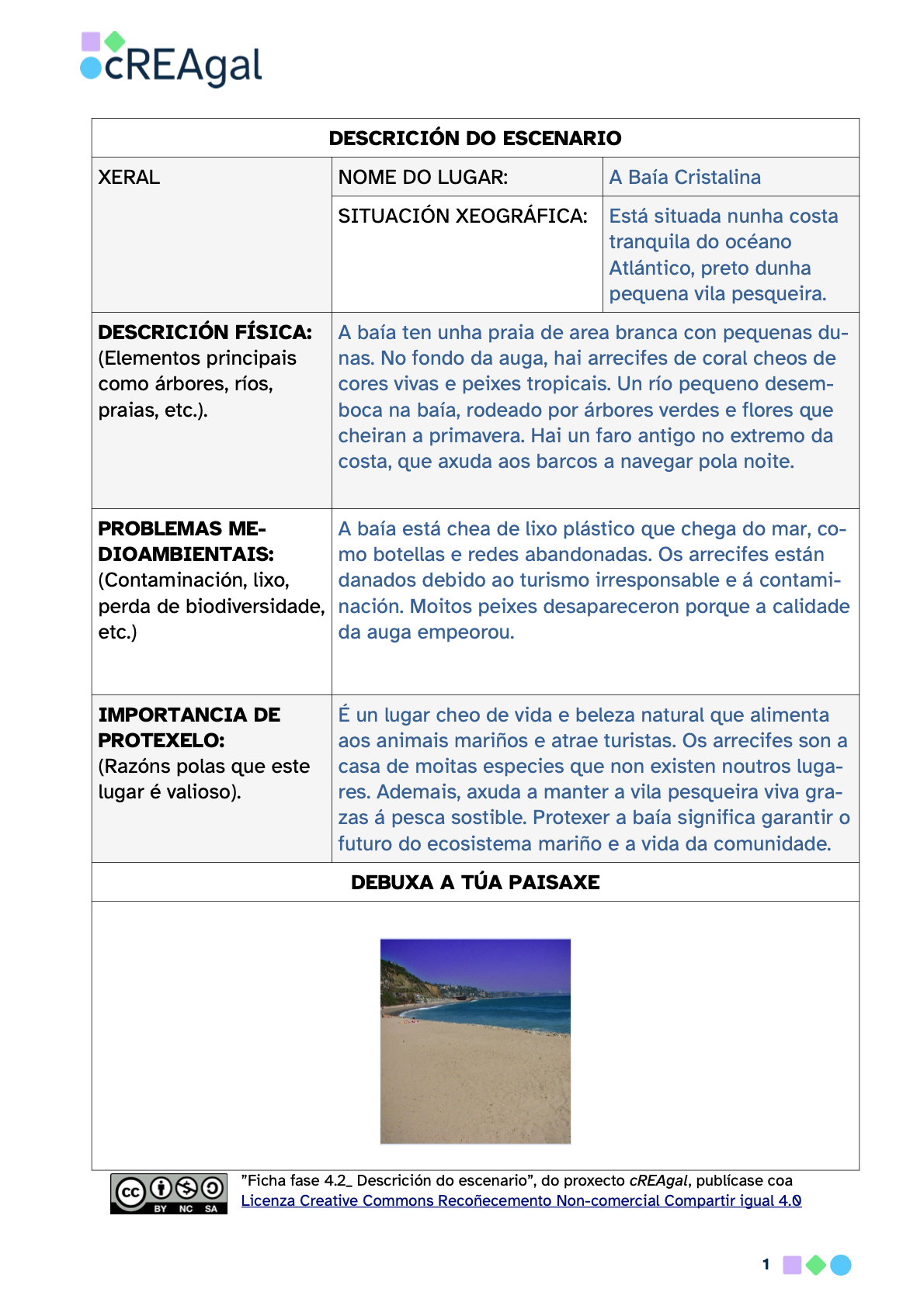 Neste reto, o grupo traballará para escoller e describir o escenario principal do proxecto (videoxogo ou vídeo viral). Este escenario será o lugar onde terá lugar a historia e deberá representar un ecosistema da contorna que necesite ser coidado e protexido.