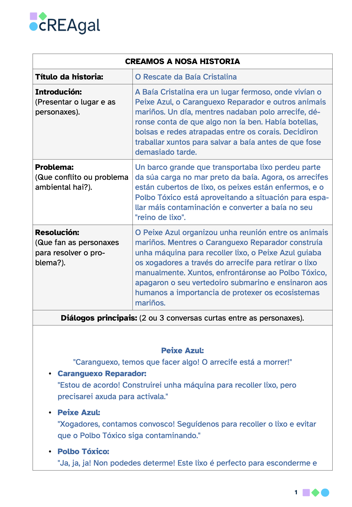 - Os diálogos deben axudar a entender a historia e transmitir a mensaxe ambiental.